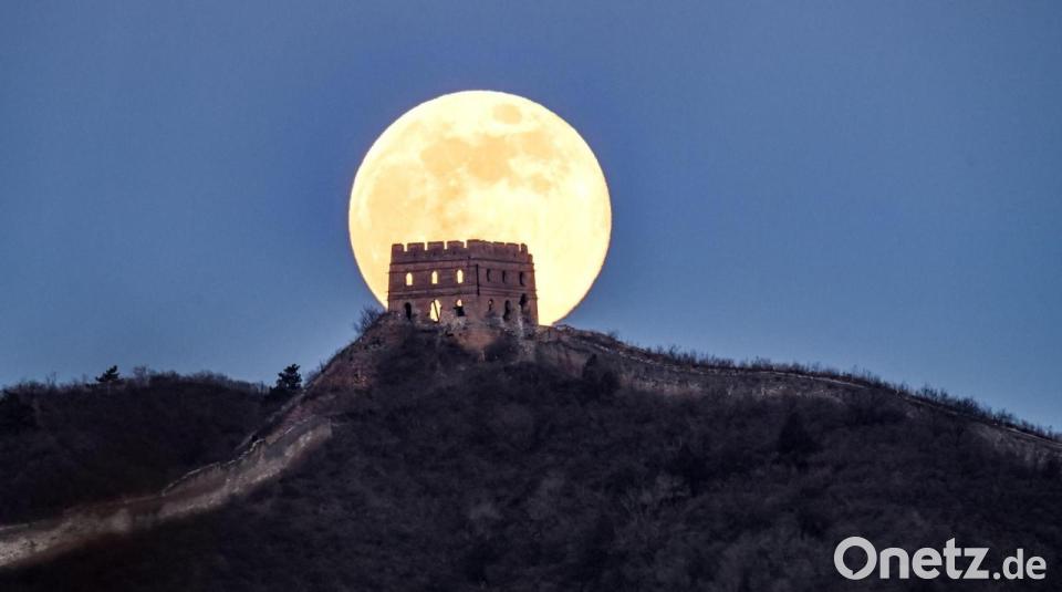 Der erste Vollmond des Jahres über dem Panlongshan-Abschnitt, der Großen Mauer in der chinesischen Hauptstadt Peking, zu sehen. Der erste Vollmond des Jahres wird auch "Wolfsmond" genannt.