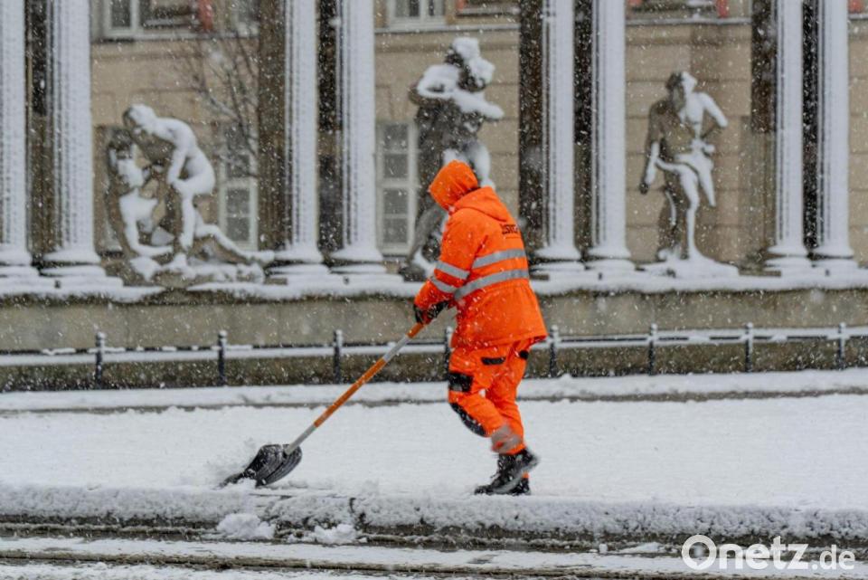 Ein Mitarbeiter der Stadtreinigung Potsdam befreit eine Tram-Haltestelle vom Schnee.