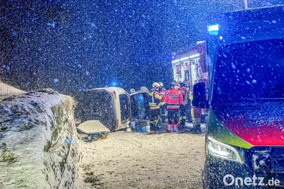 Ein Auto liegt nach einem Unfall auf der Landesstraße 108 zwischen Hornberg in Richtung Schramberg auf der Seite. Ein Wintereinbruch hat den Schwarzwald fest im Griff. Wegen vereister und zugeschneiter Straßen war es in der Nacht bundesweit zu Unfällen gekommen.