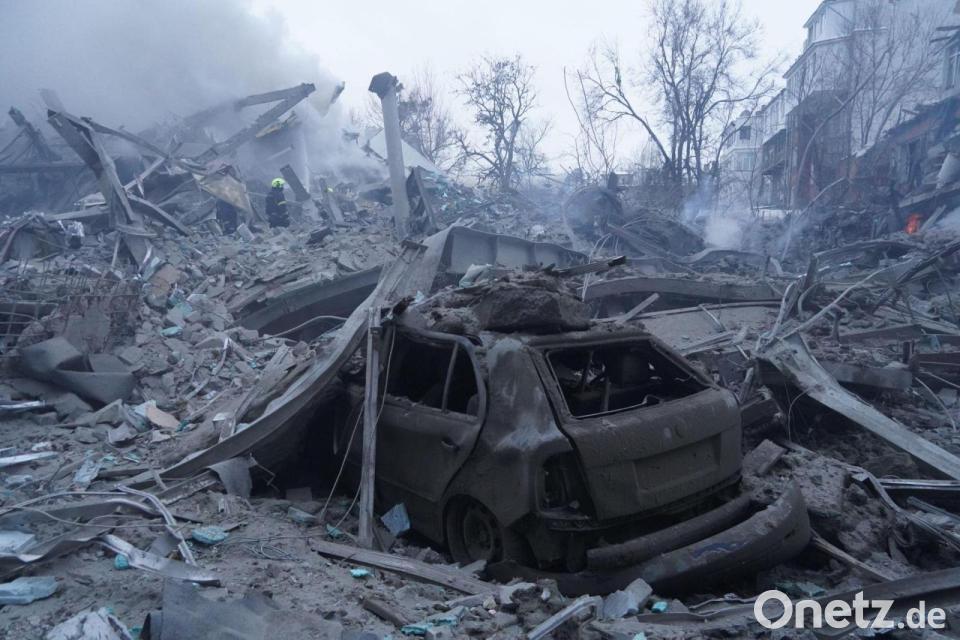 Rettungskräfte löschen einen Brand nach einem russischen Raketenangriff in Charkiw.
