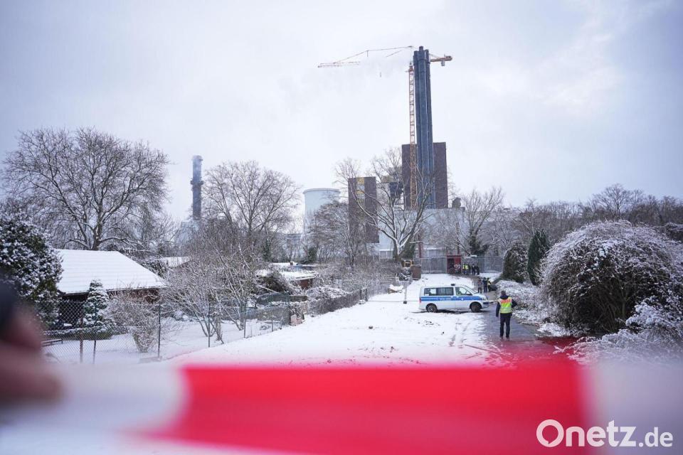 Ein Einsatzfahrzeug der Polizei steht an der Brandstelle einer Kabelbrücke vor dem Kraftwerk Lichterfelde. Nach dem Brand einer Kabelbrücke ist im Südwesten Berlins für 50.000 Haushalte und 2.000 Gewerbebetriebe der Strom ausgefallen.