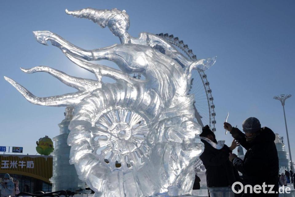 Teilnehmer legen letzte Hand an ihr Werk für den Eisskulpturenwettbewerb beim jährlichen Eis- und Schneefestival in Harbin in der chinesischen Provinz Heilongjiang.