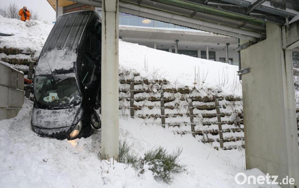 Ein Auto ist am Morgen unterhalb des Auslaufs des Eiskanals von Winterberg von der Straße abgekommen. Im Eiskanal findet der Bob-Weltcup statt.