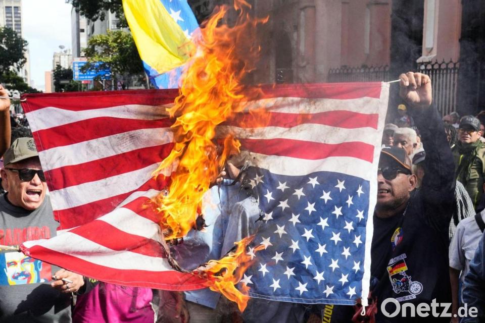 Anhänger der Regierung verbrennen eine US-Flagge in Caracas, nachdem US-Präsident Trump bekannt gegeben hatte, dass die US-Streitkräfte den venezolanischen Präsidenten Maduro und seine Frau gefangen genommen haben.