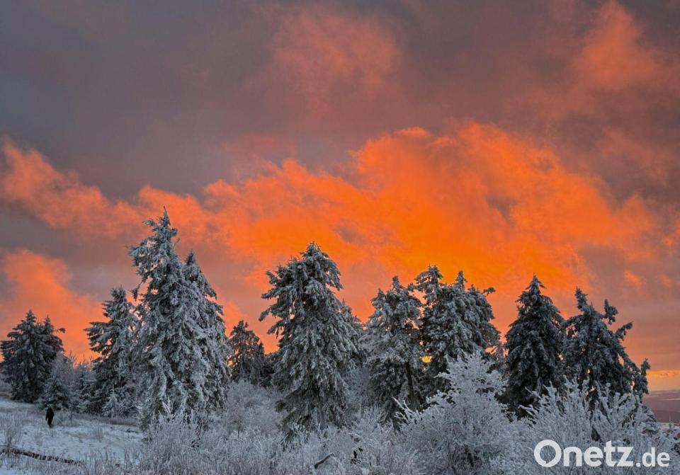 Das Licht der untergehenden Sonne beleuchtet die Wolken, die hinter den schneebedeckten Bäumen auf dem Feldbergplateau untergeht.