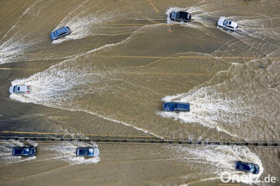 Autos fahren auf dem Highway 101 in Kalifornien, der von einer Springflut überflutet wird.