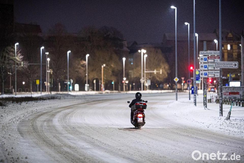Motorroller kämpft sich am frühen Morgen durch Schnee im Stadtzentrum in Hannover