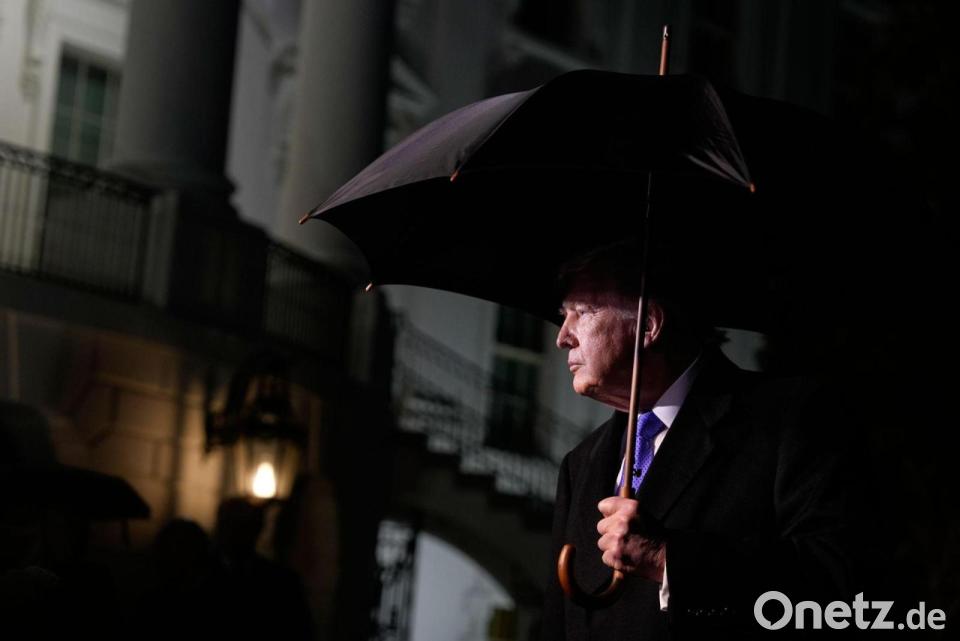 US-Präsident Donald Trump spricht mit Reportern, bevor er mit Marine One vom Südrasen des Weißen Hauses abfliegt.