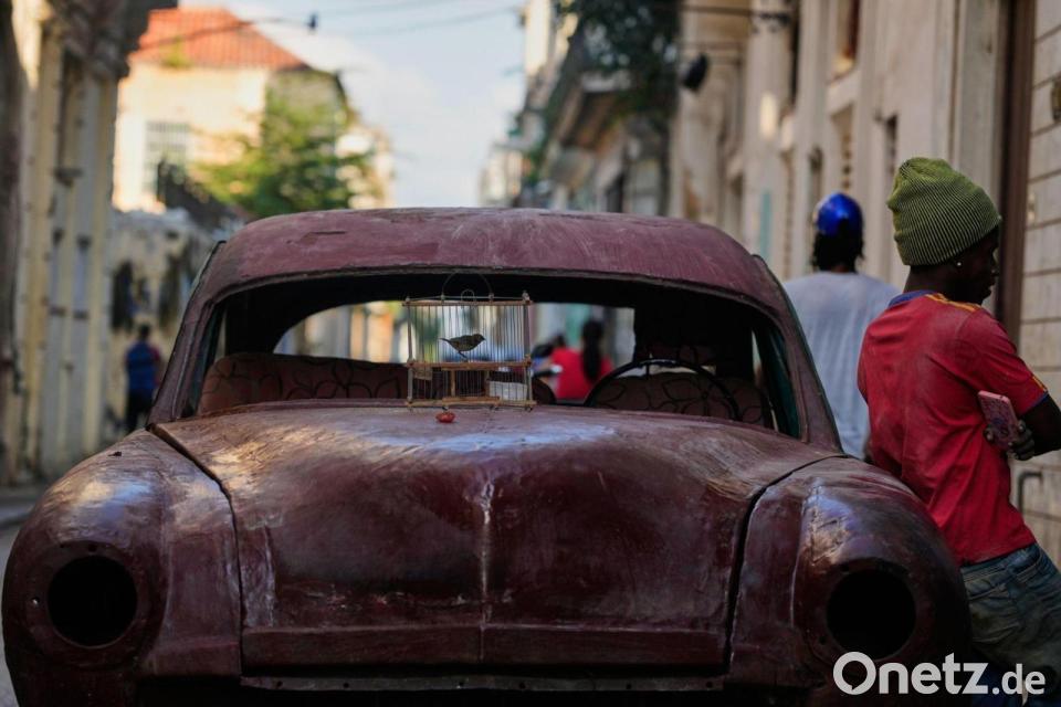 Ein Vogel in einem Käfig steht in Havanna zum Verkauf auf der Motorhaube.