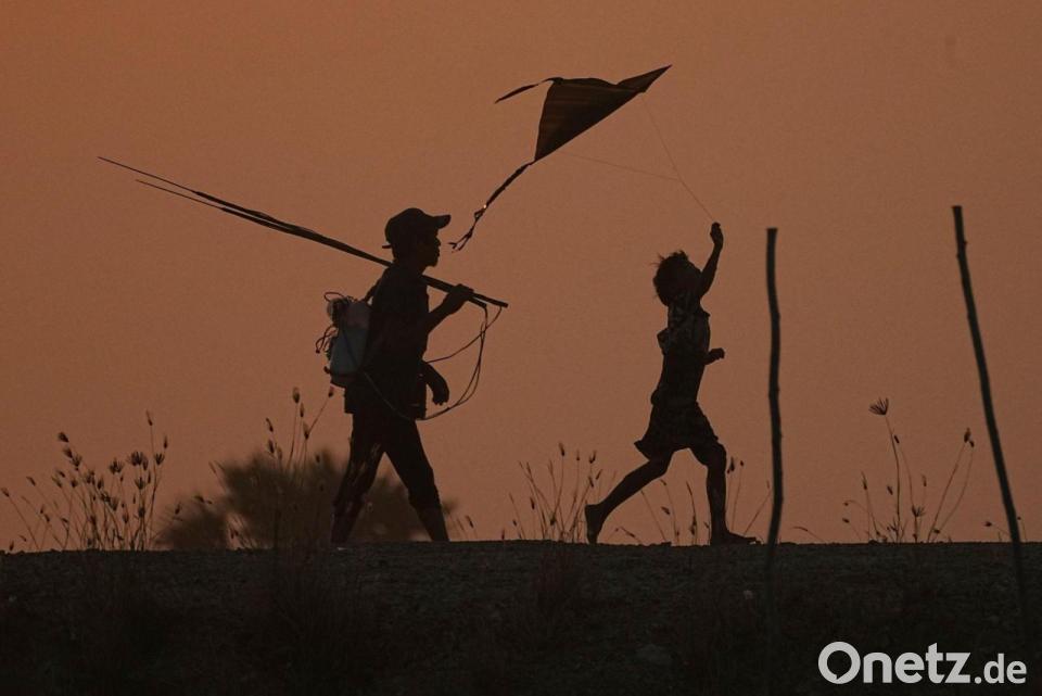 Ein Junge (r) lässt einen Drachen steigen, während er mit seinem Vater nach dem Fischen am Stadtrand von Phnom Penh nach Hause geht.