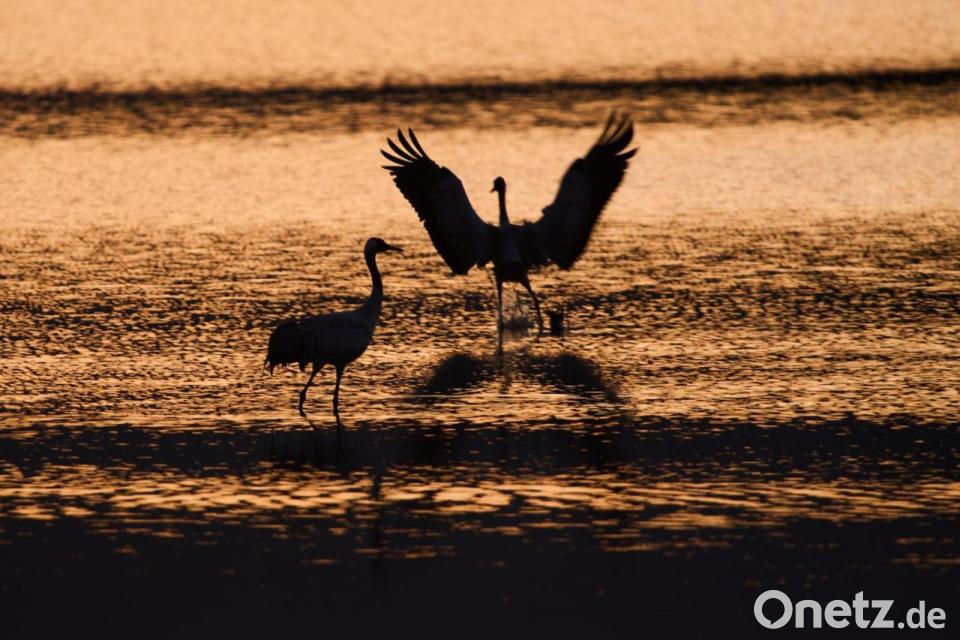 Wandernde Kraniche versammeln sich bei Sonnenaufgang im Naturschutzgebiet am Hula-See, nördlich des Sees Genezareth in Israel.