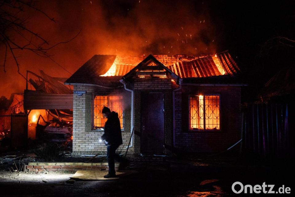 Ein Gebäude steht nach einem russischen Shahed-Drohnenangriff in Flammen.