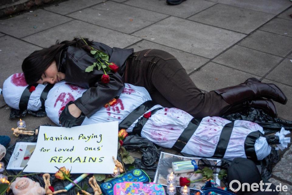 Ein Demonstrant liegt mit einem menschlichen Leichnam, der ein Opfer symbolisiert, auf dem Boden.