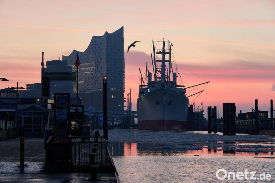 Eisbrocken liegen in der Elbe im Hafen. Im Hintergrund ist die Elbphilharmonie zu sehen.