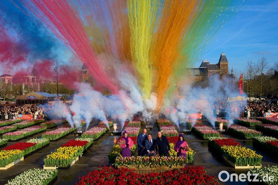 Pyrotechnik wird anlässlich des nationalen Tulpentages, der Eröffnung der Tulpensaison 2026, auf dem Museumsplatz in Amsterdam gezündet.