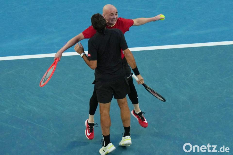 Australian Open - Eröffnungszeremonie: Roger Federer (vorne) aus der Schweiz und Andre Agassi aus den USA reagieren während der Eröffnungsfeier auf ihr Doppelspiel gegen Hewitt und Rafter aus Australien.