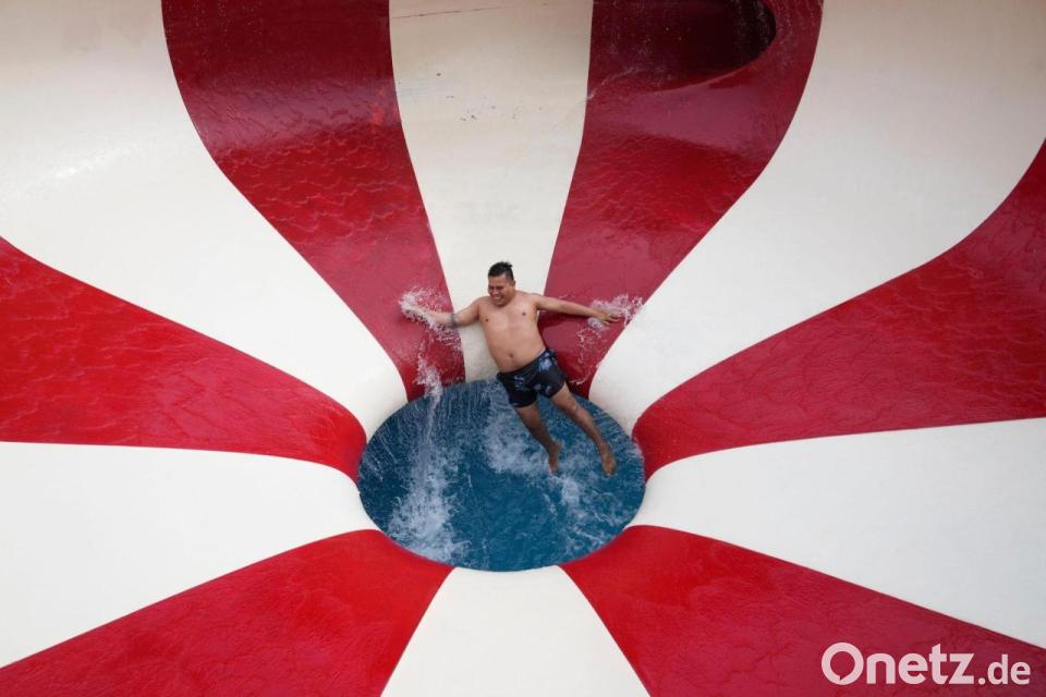 Ein Mann stürzt eine Wasserrutsche in einem öffentlichen Schwimmbad im Stadtteil Puente Piedra außerhalb von Lima hinunter.
