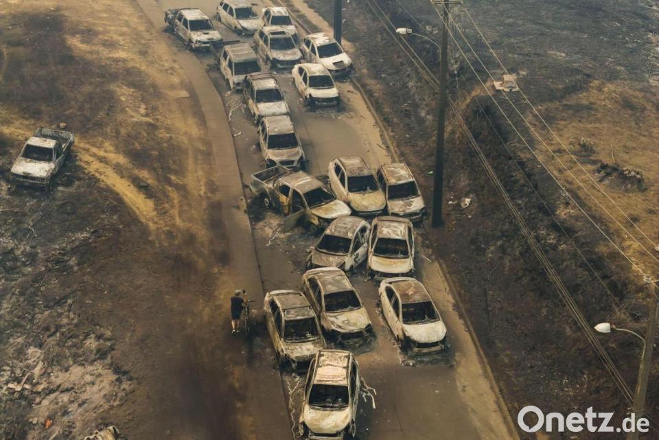 Beschädigte Fahrzeuge säumen eine Straße, nachdem Waldbrände Wohngebiete in Lirquen in Chile verwüstet haben.