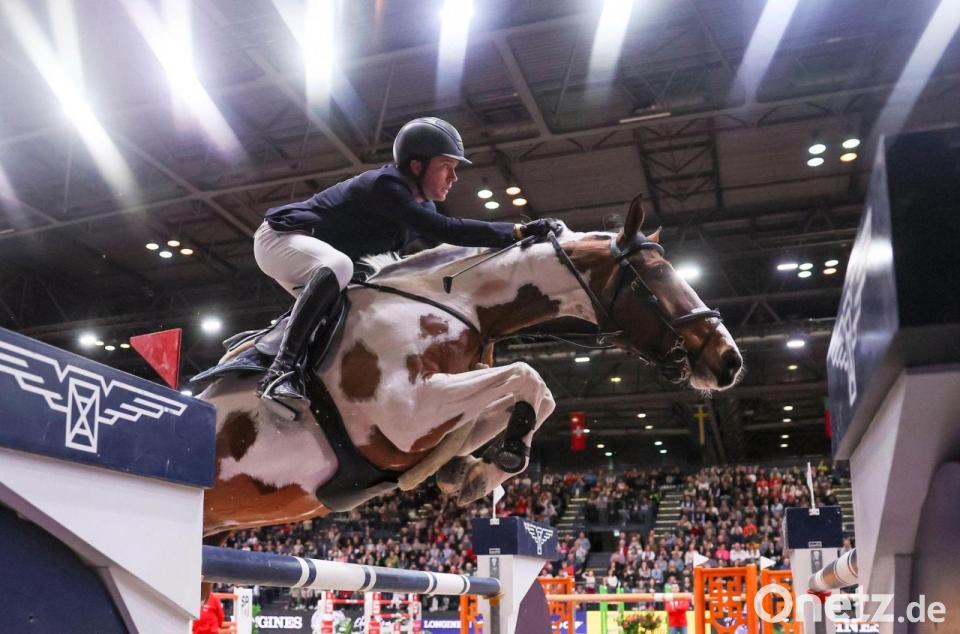 Gerrit Nieberg auf Ping Pong van de Lentamel springt im Ersten Umlauf beim Longines Fei Jumping World Cup in Leipzig.
