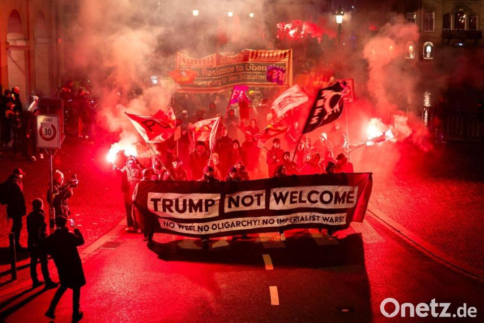 Demonstranten in Davos halten ein Transparent mit der Aufschrift „Trump Not Welcome“ während einer Kundgebung gegen das Weltwirtschaftsforum (WEF) und den Besuch von US-Präsident Trump in der Schweiz.