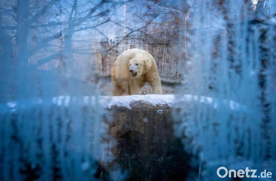 Ein Eisbär läuft bei winterlichen Temperaturen durch sein Gehege im Tierpark Hellabrunn in München.
