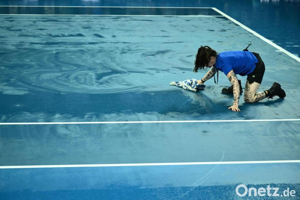 Australian Open: Eine Person trocknet den Platz mit einem Handtuch, nachdem das Spiel aufgrund des Regens unterbrochen wurde.