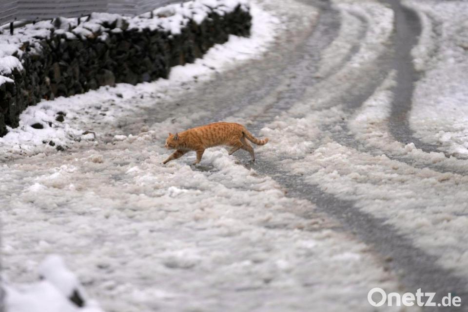 ABC, wer läuft denn da im Schnee? Eine Katze huscht im indischen Srinagar über eine schneebedeckte Straße.