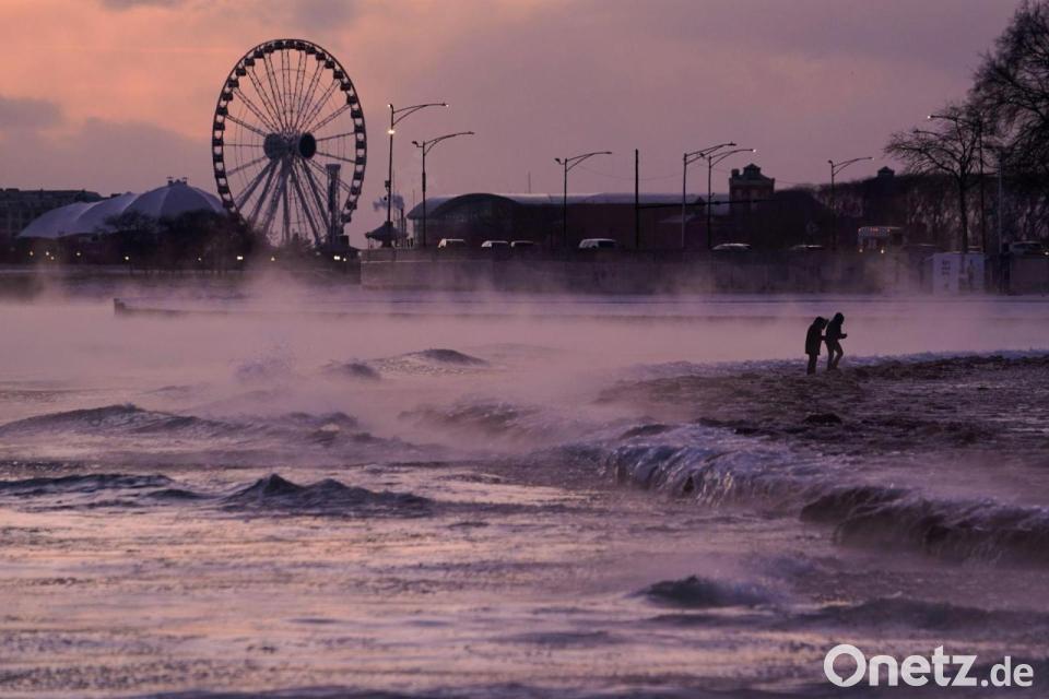 Menschen spazieren in Chicago über einen mit Eis bedeckten Strand am Ufer des Michigansees.