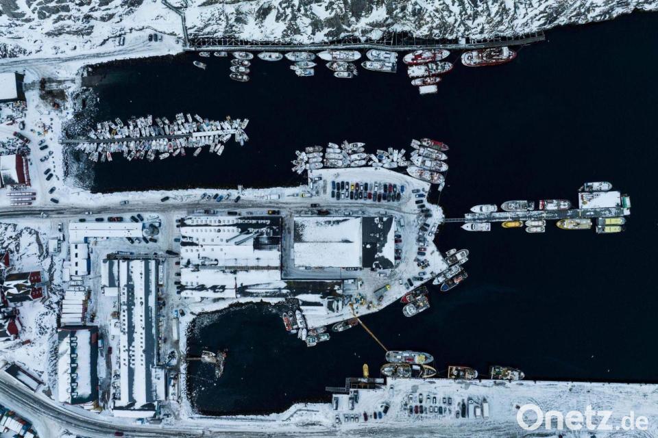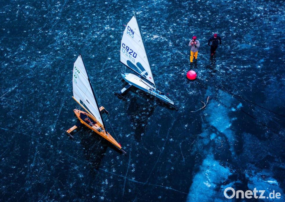Eissegler bereiten ihre Schlitten auf der mit einer etwa 15 Zentimeter dicken Eisschicht bedeckten Kleinen Müritz für einen Testfahrt vor (Luftaufnahme mit einer Drohne).