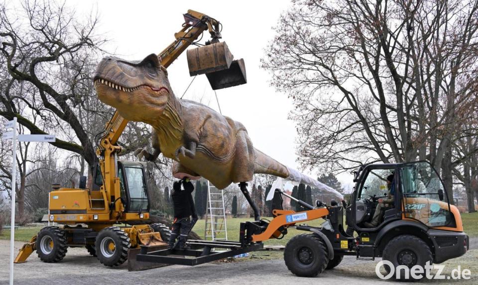 Dino am Haken: Die Nachbildung eines Tyrannosaurus Rex wird für die Ausstellung "Dino Lights" in Erfurt aufgebaut.