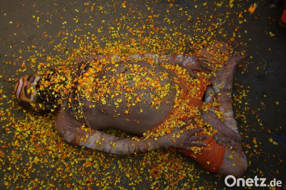 Bei einem hinduistischen Frühlingsfest in Indien liegt ein Sadhu mit Blütenblättern bedeckt auf der Straße.