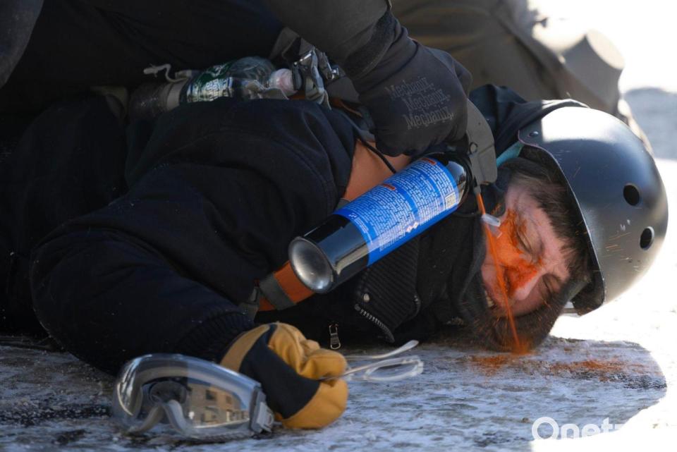 Ein Demonstrant wird aus nächster Nähe mit Pfefferspray besprüht.