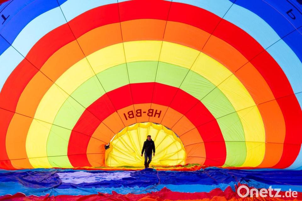 Ein Teammitglied überprüft seinen Heißluftballon vor dem Start während des 46. Internationalen Heißluftballon-Festivals in Chateau-d'Oex.