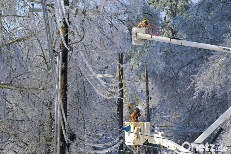 Ein Elektriker arbeitet nach einem Eissturm Wiederherstellung der Stromversorgung in Oxford, Mississippi.