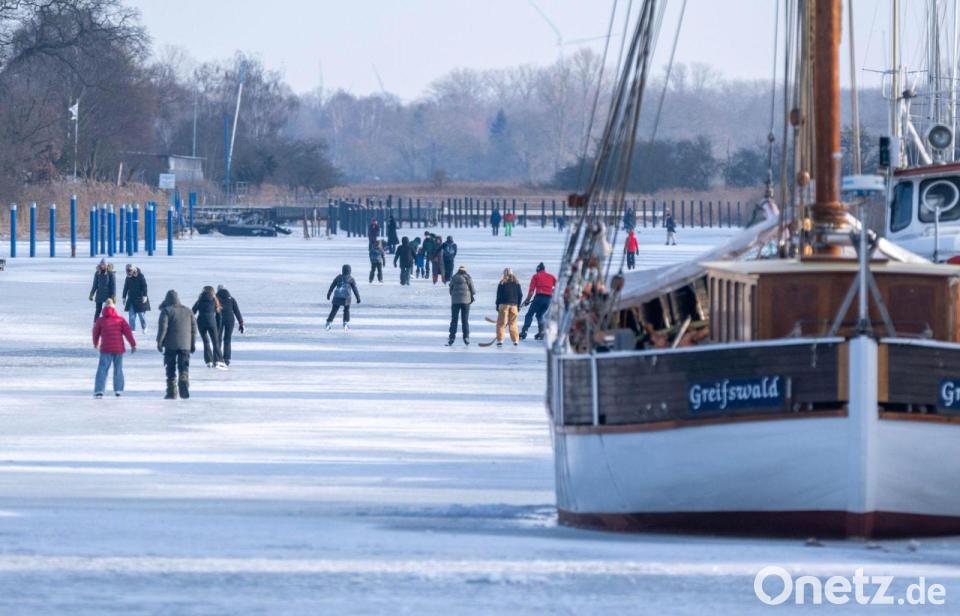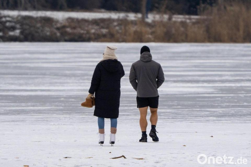 Unten kurz bei Minusgraden: Menschen laufen auf einem zugefrorenen See in Potsdam übers Eis.
