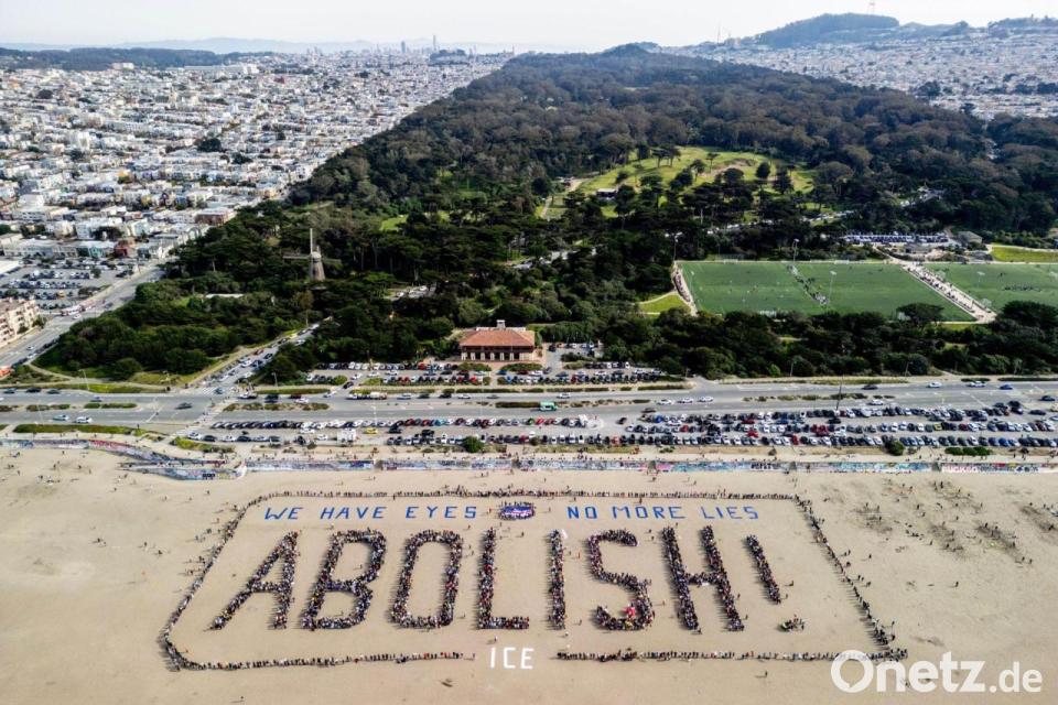 Demonstranten bilden ein menschliches Banner „We have eyes - no more lies - Abolish“ am Ocean Beach in San Francisco während eines Protests gegen die US-Einwanderungsbehörde ICE.