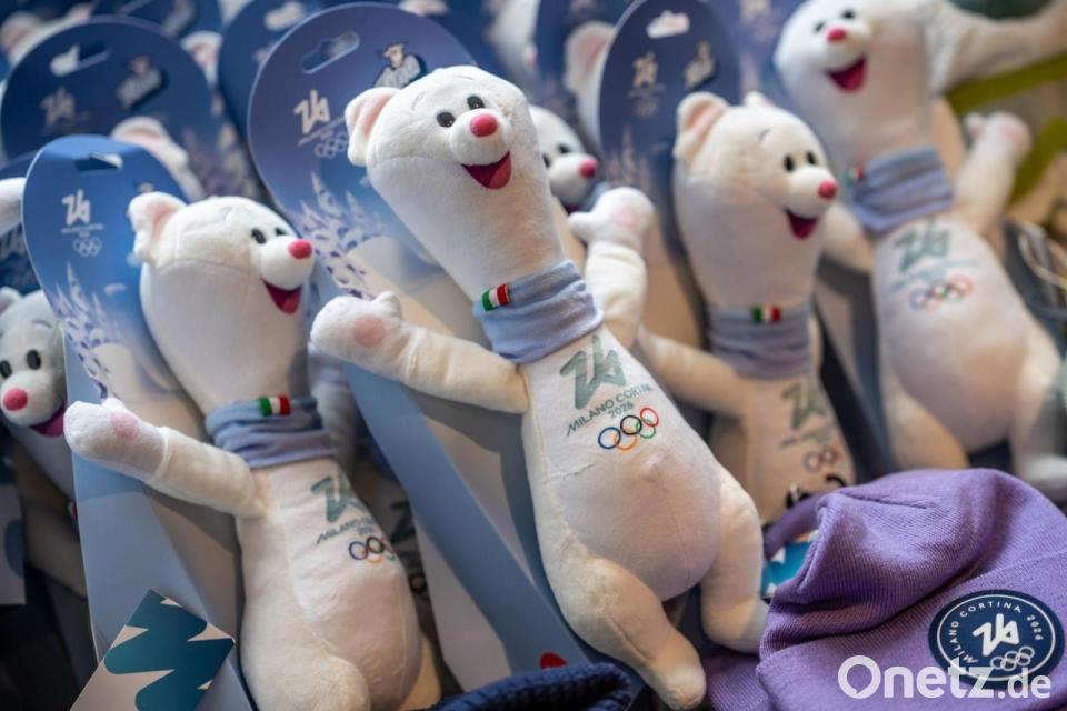 Tina, das offizielle Maskottchen der Olympischen Winterspiele 2026 Mailand und Cortina, liegt in einem Merchandising Shop in Cortina bereit. Die Olympischen Winterspiele 2026 finden in Mailand und Cortina d'Ampezzo statt.