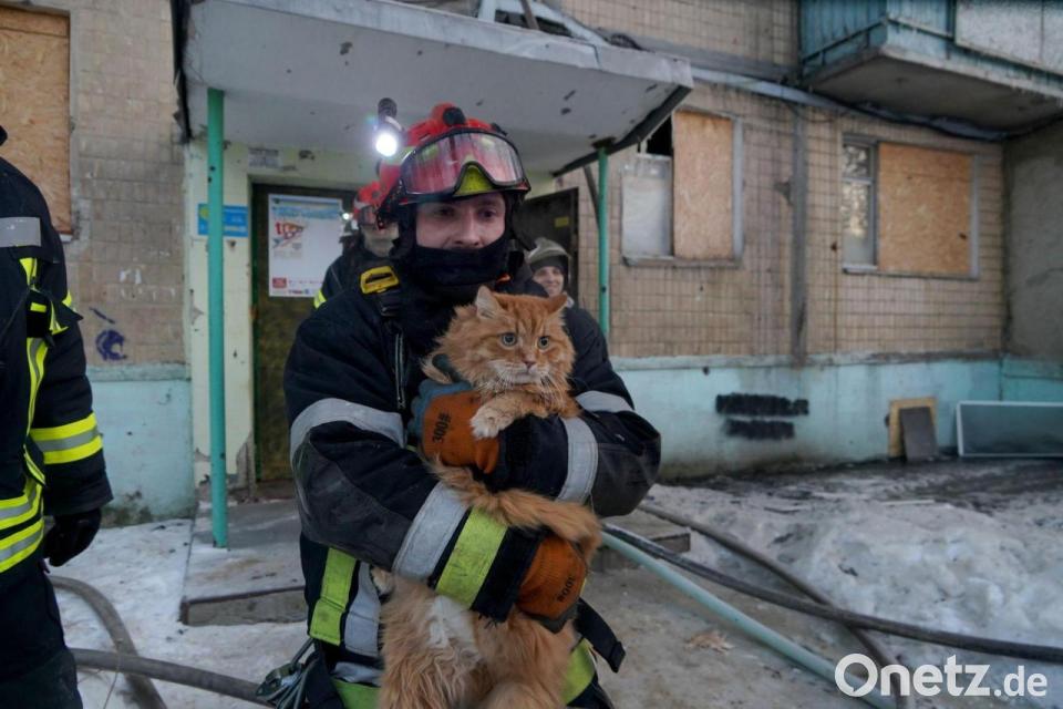 Ein Retter evakuiert eine Katze, nachdem eine russische Drohne bei einem Luftangriff ein Wohnhaus getroffen hat.