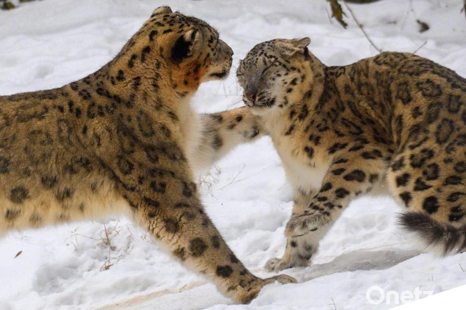 Zwei Schneeleoparden tollen im Magdeburger Zoo in ihrem verschneiten Freigehege miteinander.