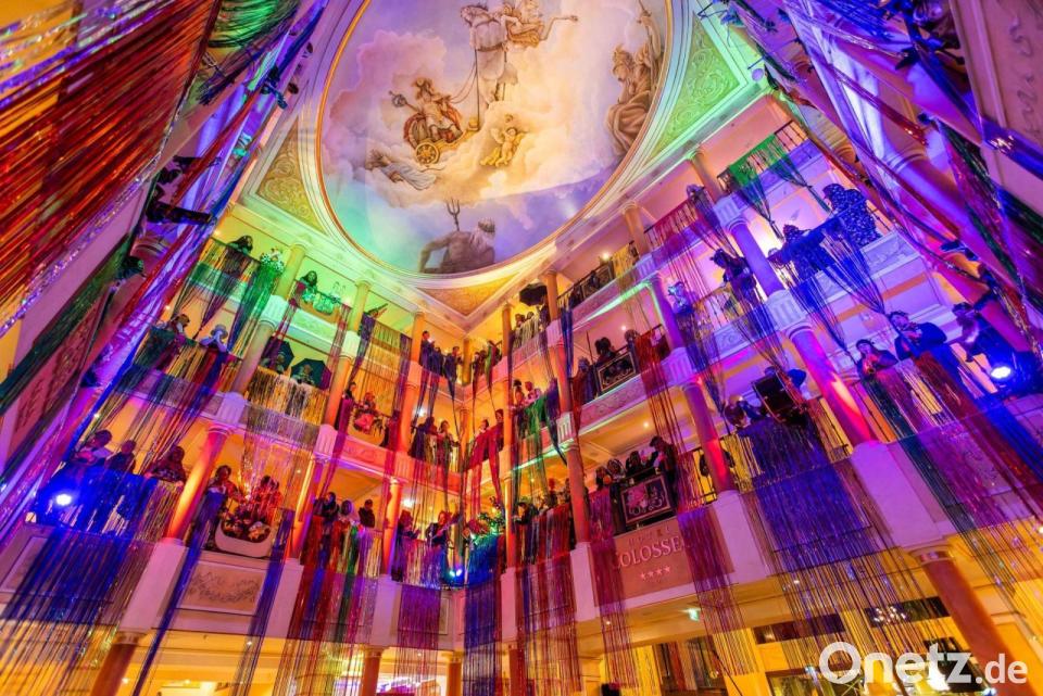 Narren stehen im Foyer des Hotel Colosseo über die Etagen verteilt. Die "Goldene Narrenschelle" wird jährlich von der Vereinigung Schwäbisch-Alemannischer Narrenzünfte (VSAN) verliehen.