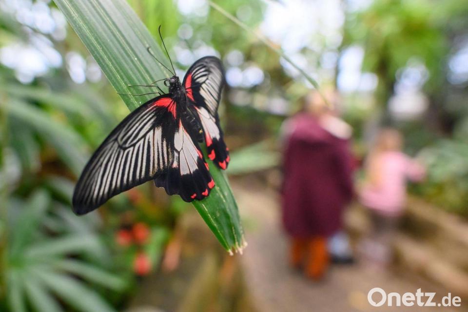 Ein Scharlachroter Ritter sitzt im Schmetterlingshaus vom Elbauenpark in Magdeburg auf einem Blatt einer Tropenpflanze.