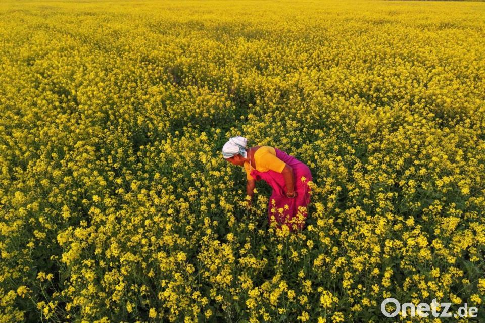 Eine aus dem Stamm der Bodo stammende Frau arbeitet in einem Senffeld am Rande von Guwahati.