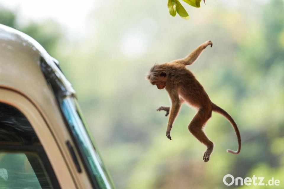 Ein Ceylon-Hutaffe macht auf Sri Lanka einen weiten Sprung. Diese Affen sorgen manchmal für Ärger, wenn sie von Menschen Lebensmittel stehlen.