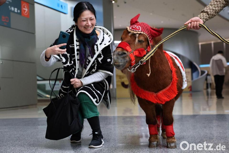 Eine Besucherin macht Bilder von einem Shetlandpony in einer Ausstellung zu Pferden in Geschichte und Kultur im chinesischen Shanghai.