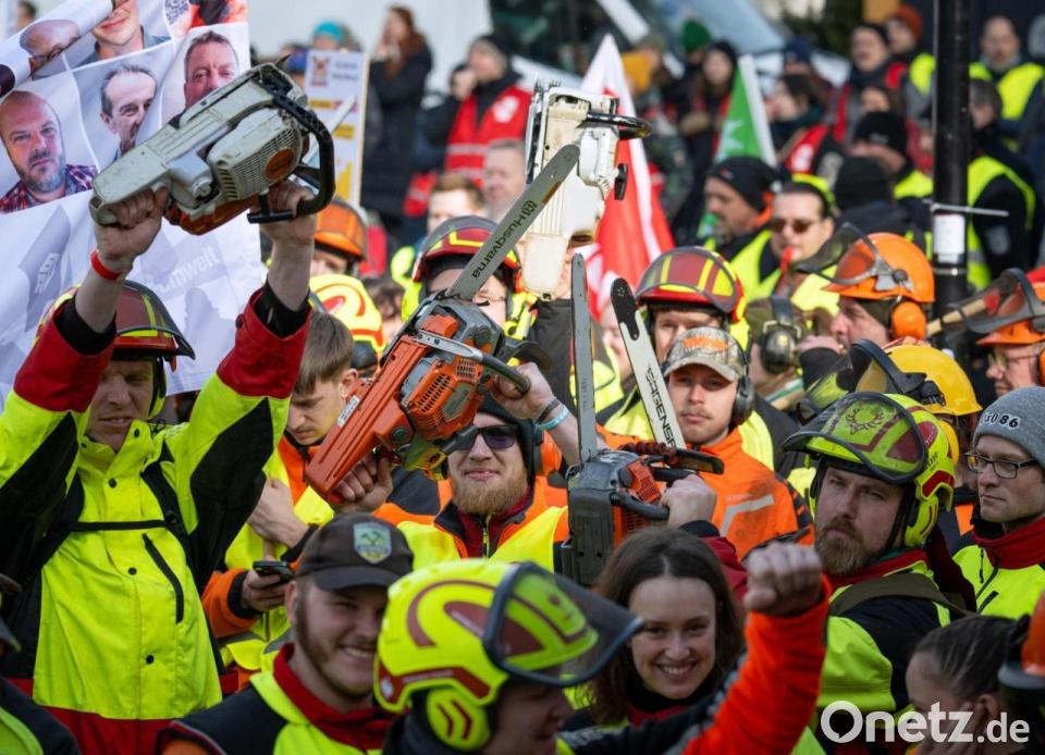 Forstarbeiter demonstrieren in Potsdam mit Kettensägen vor Beginn der dritten Runde der Tarifverhandlungen für den öffentlichen Dienst der Länder.