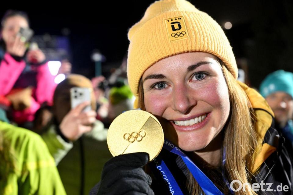 Julia Taubitz jubelt mit ihrer Goldmedaille bei den Olympischen Winterspielen Mailand Cortina 2026.