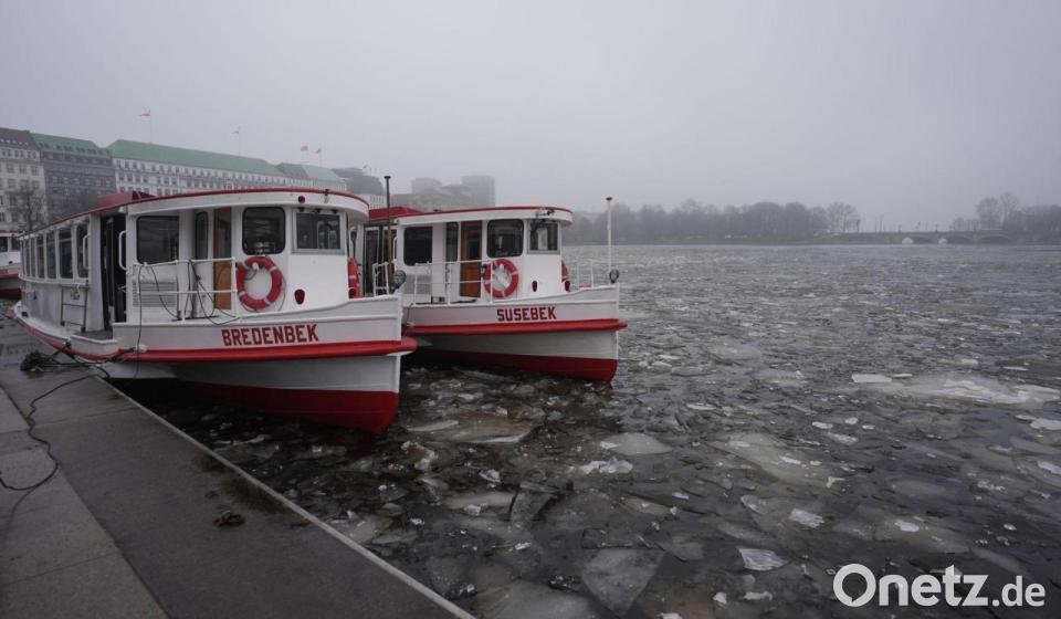 Dicke Eisschollen schwimmen auf der Binnenalster in der Innenstadt von Hamburg.