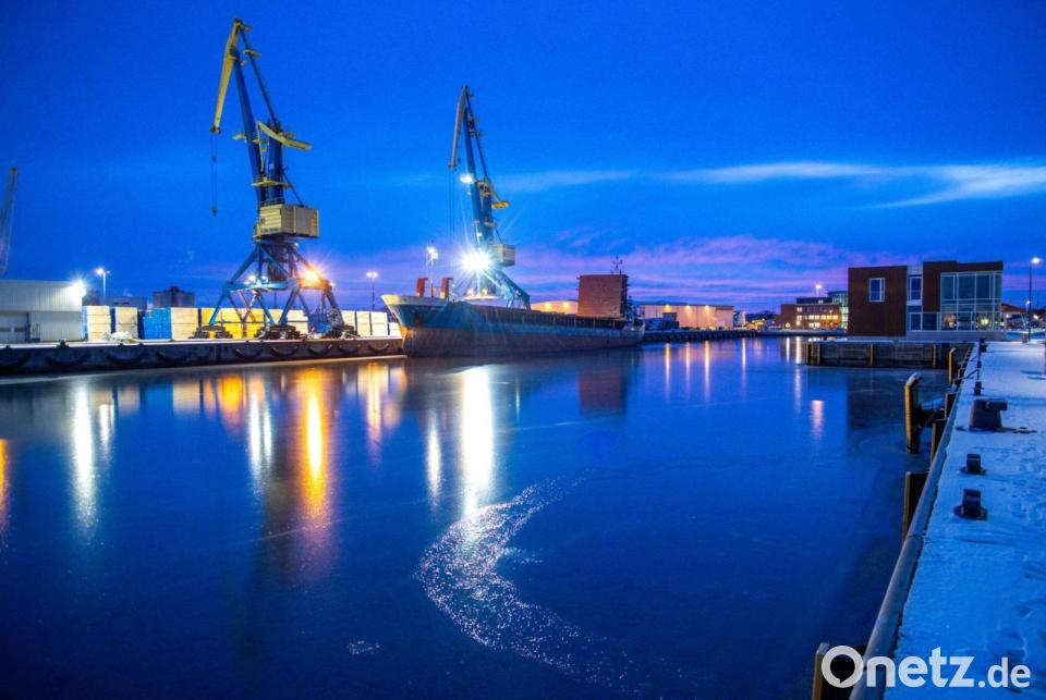 Eine Eisschicht hat sich auf der Wasserfläche in einem Becken des Seehafens in Wismar an der Ostsee gebildet.