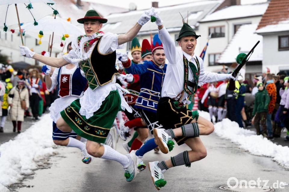 Die Springerpärchen tanzen beim traditionellen Springerzug in Herbstein am Rosenmontag.