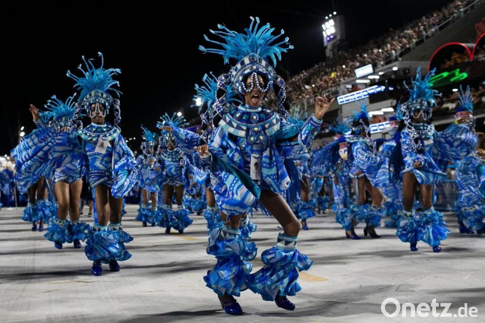 Darsteller der Sambaschule Portela paradieren während der Karnevalsfeierlichkeiten am frühen Morgen auf dem Sambadrom in Rio de Janeiro.